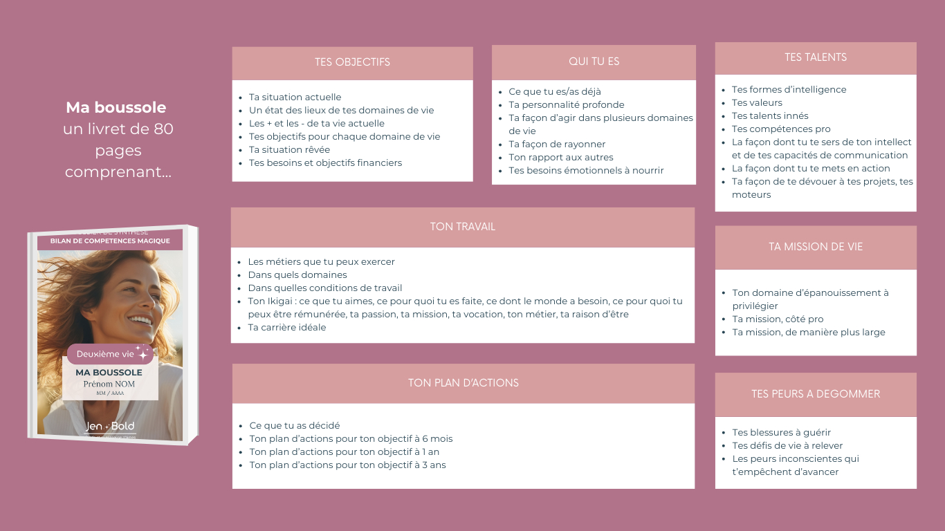 Mon accompagnement phare n’est pas juste un bilan de compétences. C’est une méthode pour t’aider à créer ta deuxième vie – la VRAIE. Parce qu’après le chaos, il y a toujours une renaissance. 🌟